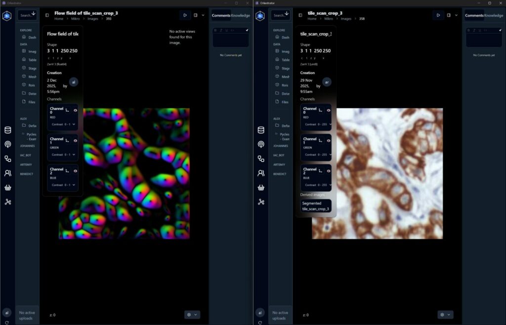 OpenUC2’s core contribution is (obviously) the microscope. We provided the OpenUC2 FRAME microscope as an affordable, modular imaging node that can be tightly integrated into an automation stack. Beyond the hardware, the microscope is designed to operate headless and to expose scanning functions that fit into a service-based architecture. That matters because the microscope is not treated as a special one-off instrument, but as a programmable component in a distributed workflow. The OpenUC2 microscope captures tile scans that can be stitched into large mosaics and compared across staining cycles, making it possible to support quality control and downstream segmentation without relying on proprietary scanning infrastructure. We integrated the necessary services through arkitekt in a simple controller: https://github.com/openUC2/ImSwitch/blob/master/imswitch/imcontrol/controller/controllers/ArkitektController.py. this one adapts the function to scan a slide to the Service world of Arkitekt.