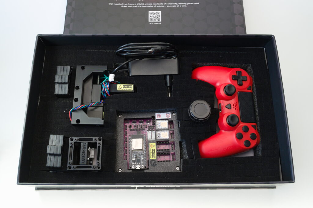 - UC2 Electronics (ESP32-based, 2×2 cube, slots for TMC2209 stepper drivers, ports for LEDs, lasers, and other peripherals, compatible with UC2-eSP firmware)